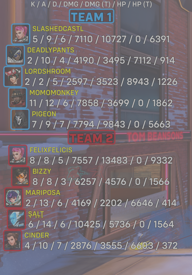 | Team | Player | Kills | Assists | Deaths | Damage | Damage (Taken) | Healing | Healing (Taken) |