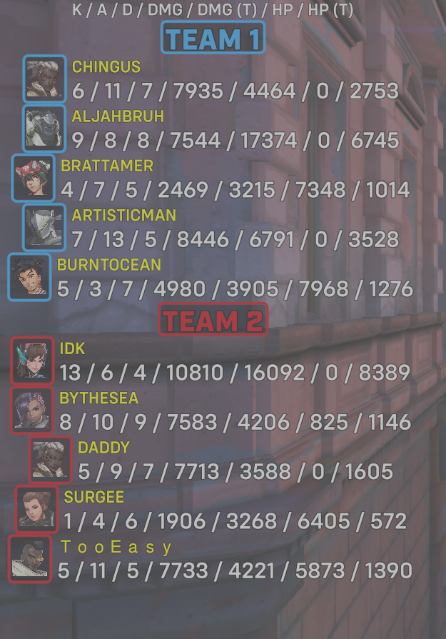 | Team | Player | Kills | Assists | Deaths | Damage | Damage (Taken) | Healing | Healing (Taken) |