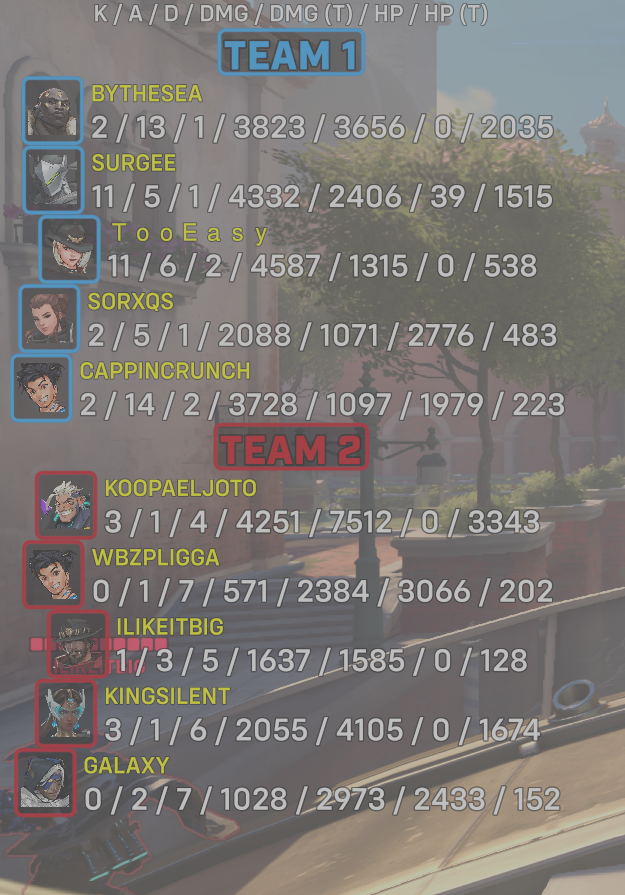 | Team | Player | Kills | Assists | Deaths | Damage | Damage (Taken) | Healing | Healing (Taken) |