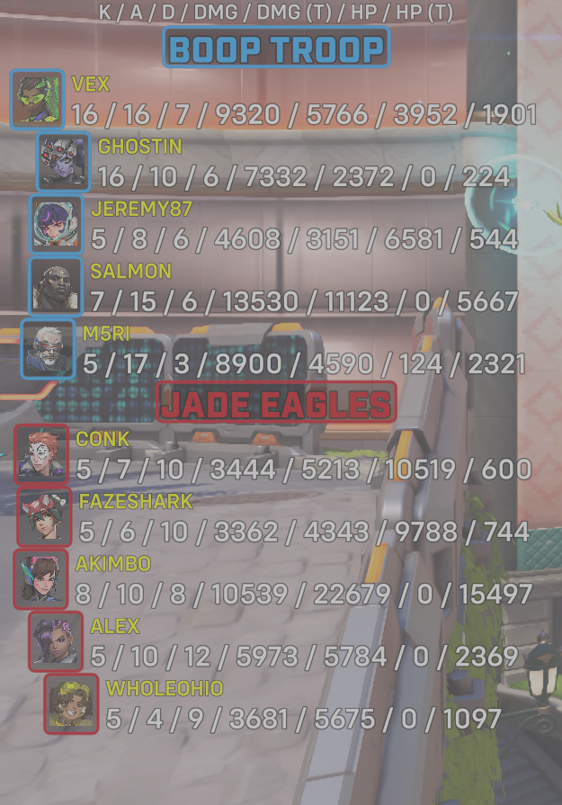 | Team | Player | Kills | Assists | Deaths | Damage | Damage (Taken) | Healing | Healing (Taken) |