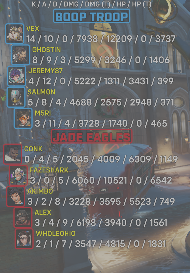 | Team | Player | Kills | Assists | Deaths | Damage | Damage (Taken) | Healing | Healing (Taken) |