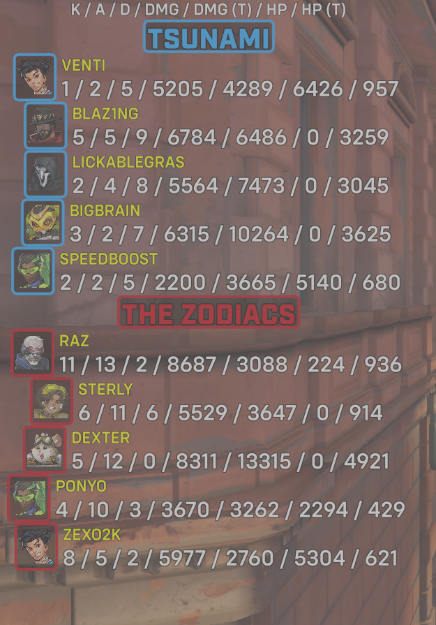 | Team | Player | Kills | Assists | Deaths | Damage | Damage (Taken) | Healing | Healing (Taken) |
