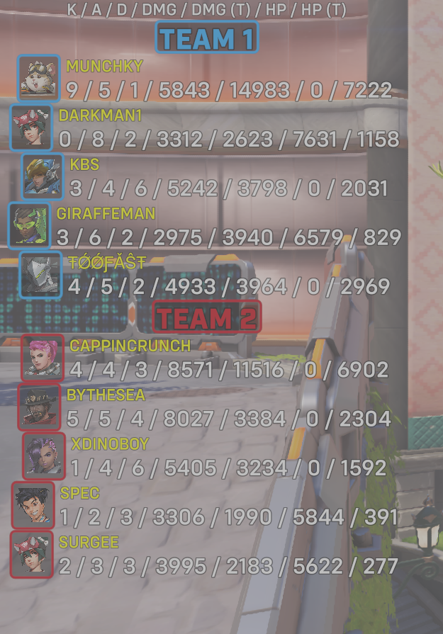 | Team | Player | Kills | Assists | Deaths | Damage | Damage (Taken) | Healing | Healing (Taken) |
