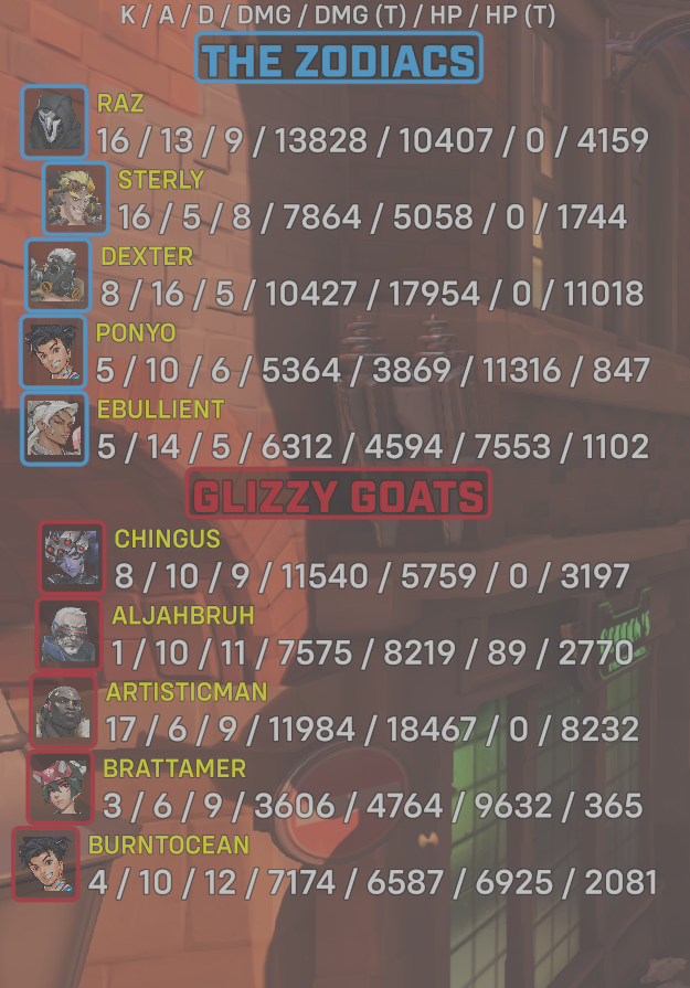 | Team | Player | Kills | Assists | Deaths | Damage | Damage (Taken) | Healing | Healing (Taken) |