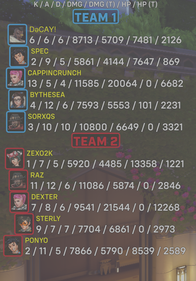 | Team | Player | Kills | Assists | Deaths | Damage | Damage (Taken) | Healing | Healing (Taken) |