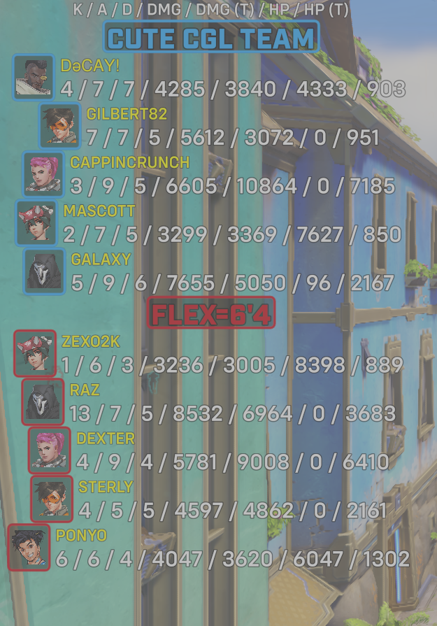 | Team | Player | Kills | Assists | Deaths | Damage | Damage (Taken) | Healing | Healing (Taken) |