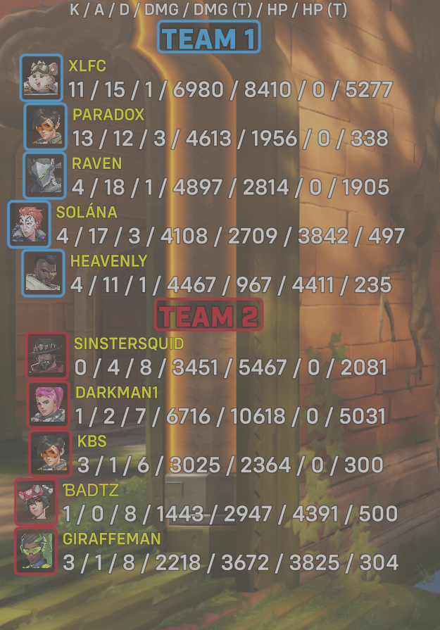 | Team | Player | Kills | Assists | Deaths | Damage | Damage (Taken) | Healing | Healing (Taken) |