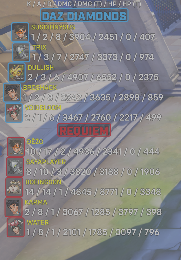 | Team | Player | Kills | Assists | Deaths | Damage | Damage (Taken) | Healing | Healing (Taken) |