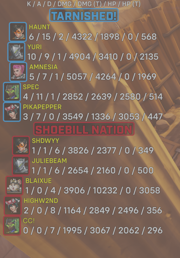 | Team | Player | Kills | Assists | Deaths | Damage | Damage (Taken) | Healing | Healing (Taken) |
