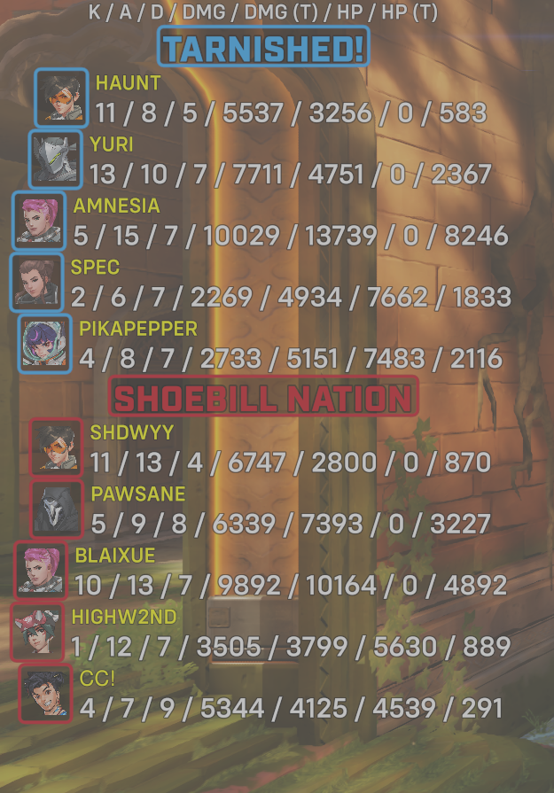 | Team | Player | Kills | Assists | Deaths | Damage | Damage (Taken) | Healing | Healing (Taken) |