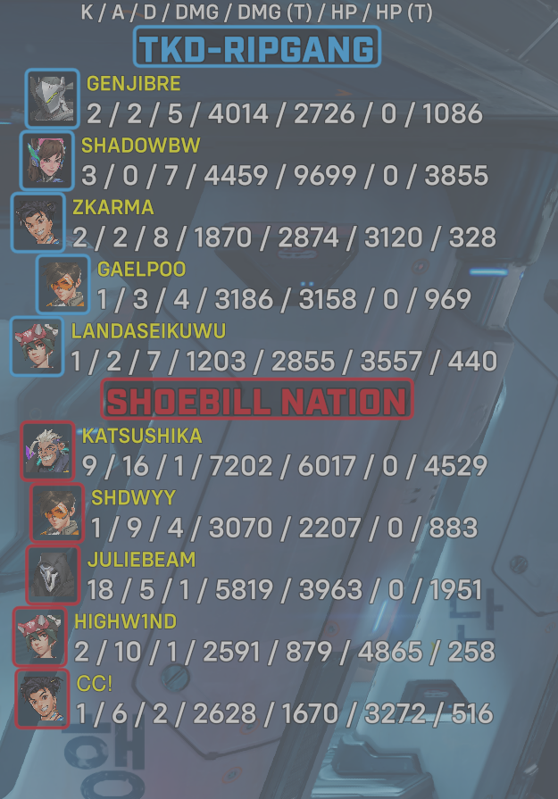 | Team | Player | Kills | Assists | Deaths | Damage | Damage (Taken) | Healing | Healing (Taken) |
