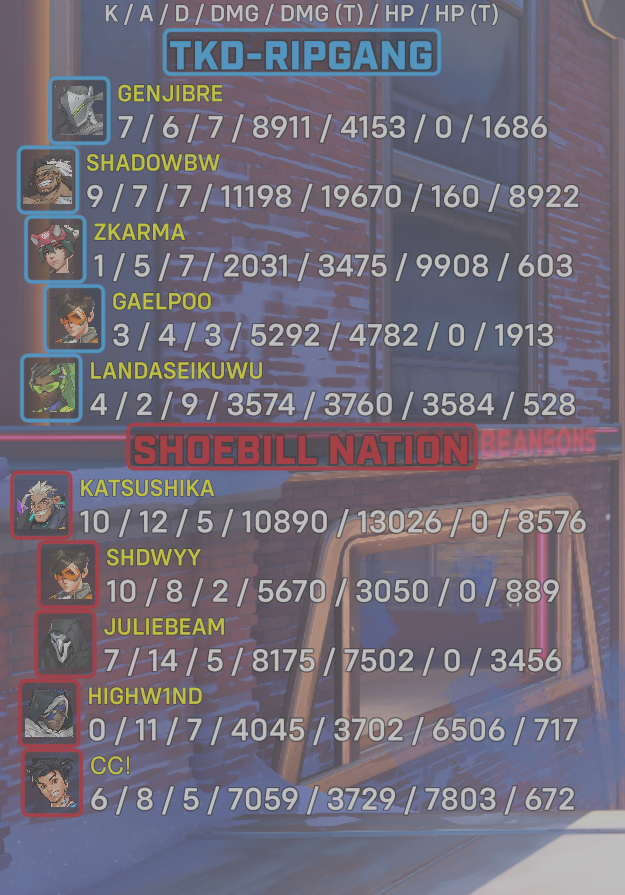 | Team | Player | Kills | Assists | Deaths | Damage | Damage (Taken) | Healing | Healing (Taken) |