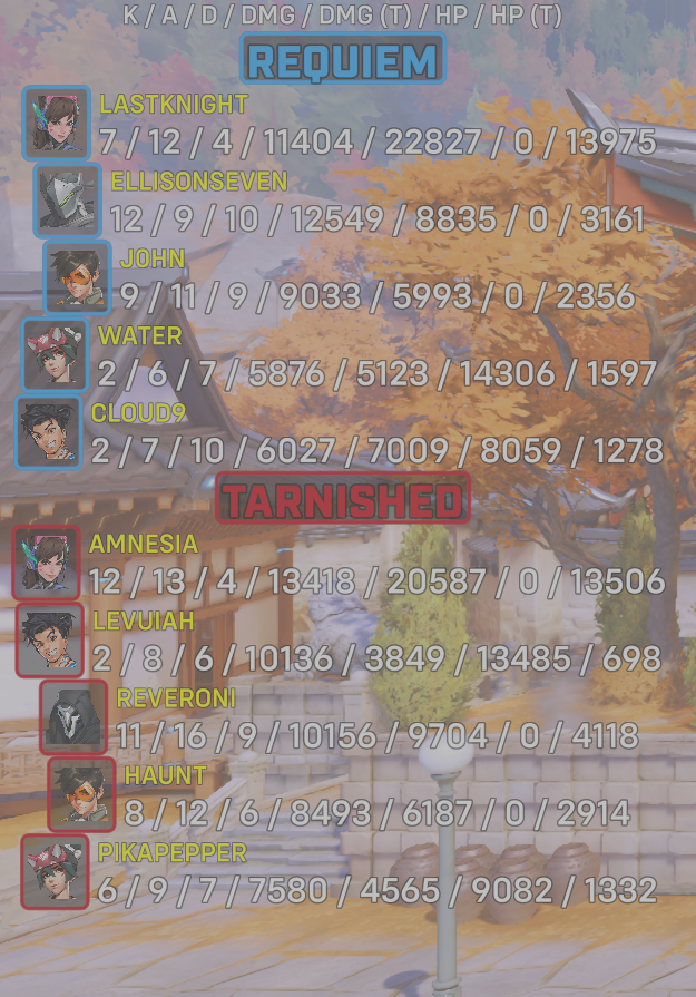 | Team | Player | Kills | Assists | Deaths | Damage | Damage (Taken) | Healing | Healing (Taken) |