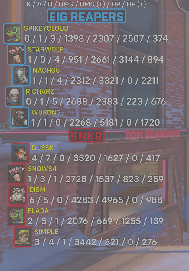 | Team | Player | Kills | Assists | Deaths | Damage | Damage (Taken) | Healing | Healing (Taken) |