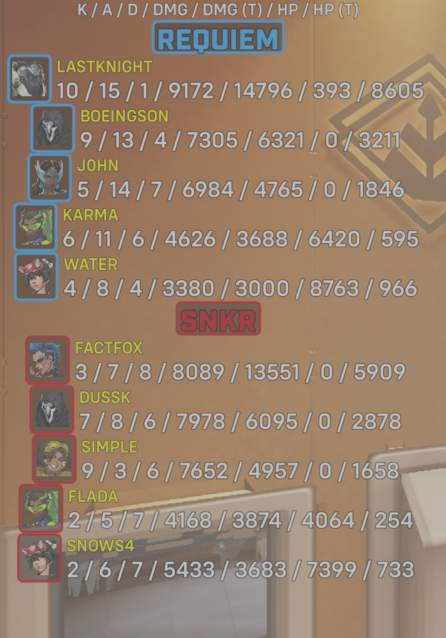 | Team | Player | Kills | Assists | Deaths | Damage | Damage (Taken) | Healing | Healing (Taken) |