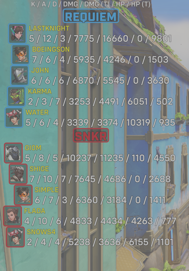 | Team | Player | Kills | Assists | Deaths | Damage | Damage (Taken) | Healing | Healing (Taken) |