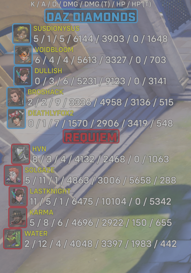 | Team | Player | Kills | Assists | Deaths | Damage | Damage (Taken) | Healing | Healing (Taken) |