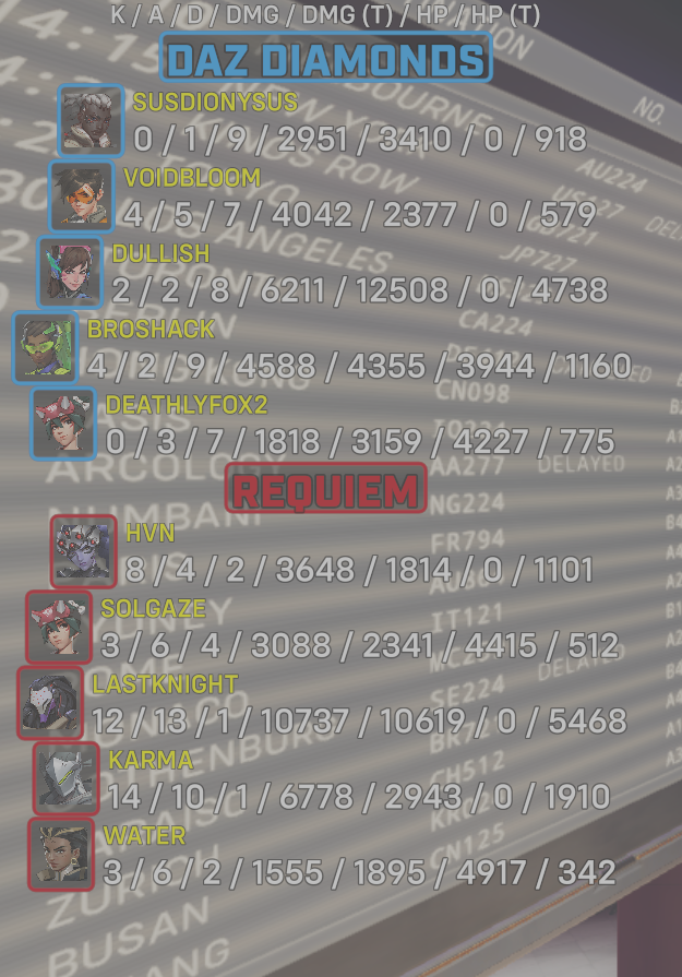 | Team | Player | Kills | Assists | Deaths | Damage | Damage (Taken) | Healing | Healing (Taken) |