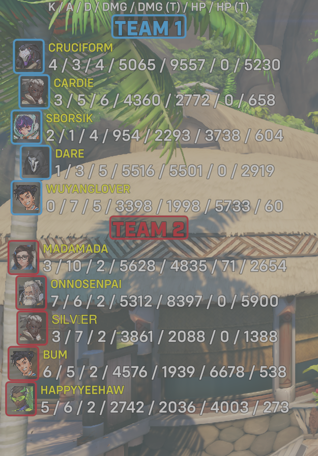 | Team | Player | Kills | Assists | Deaths | Damage | Damage (Taken) | Healing | Healing (Taken) |