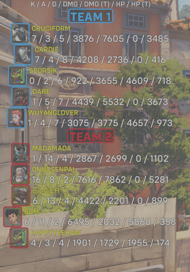 | Team | Player | Kills | Assists | Deaths | Damage | Damage (Taken) | Healing | Healing (Taken) |
