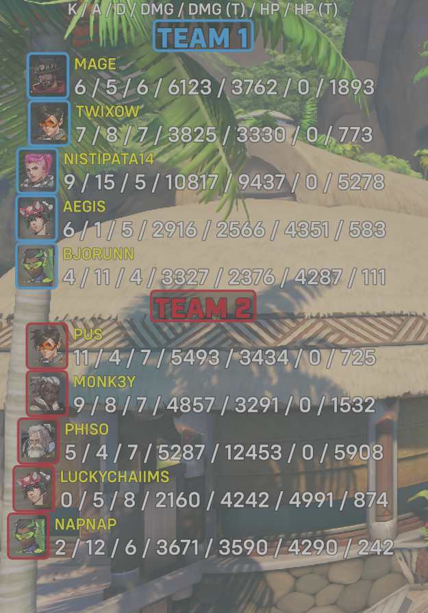 | Team | Player | Kills | Assists | Deaths | Damage | Damage (Taken) | Healing | Healing (Taken) |