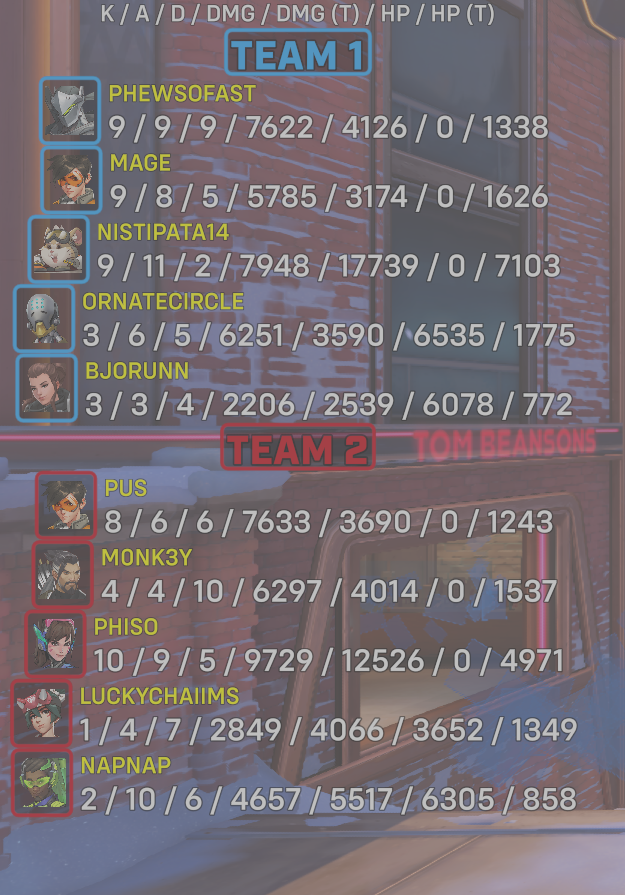 | Team | Player | Kills | Assists | Deaths | Damage | Damage (Taken) | Healing | Healing (Taken) |