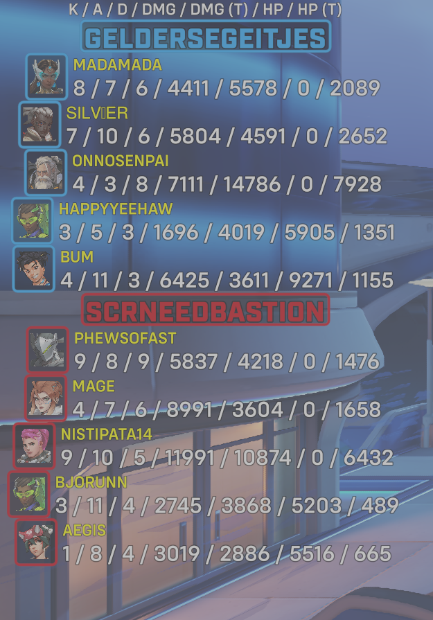 | Team | Player | Kills | Assists | Deaths | Damage | Damage (Taken) | Healing | Healing (Taken) |