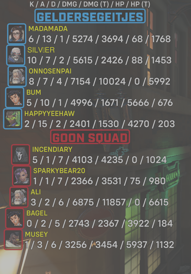 | Team | Player | Kills | Assists | Deaths | Damage | Damage (Taken) | Healing | Healing (Taken) |