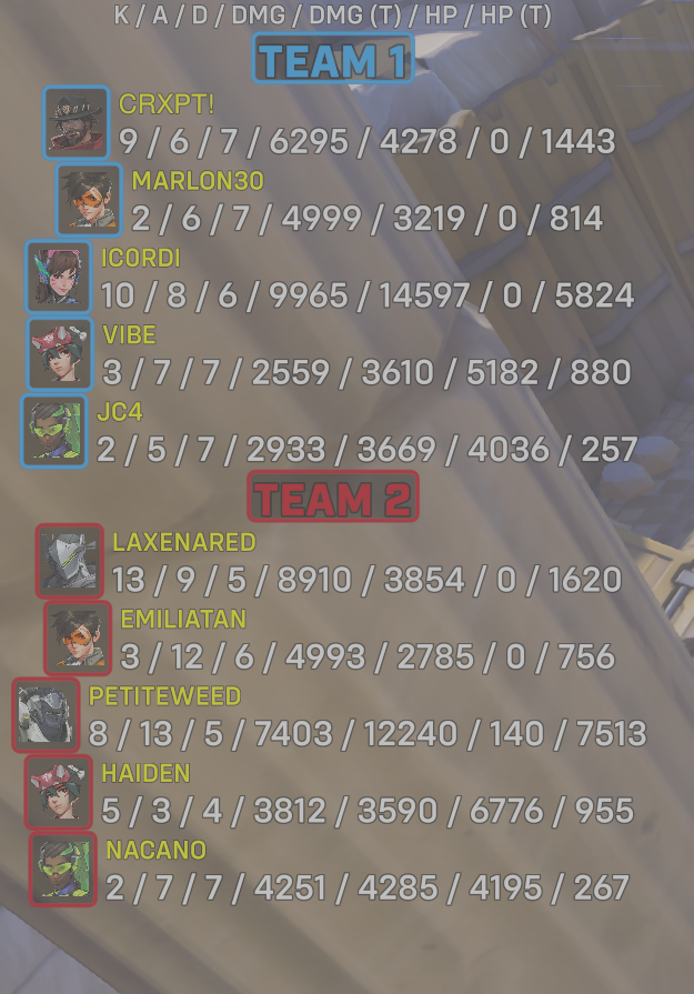| Team | Player | Kills | Assists | Deaths | Damage | Damage (Taken) | Healing | Healing (Taken) |