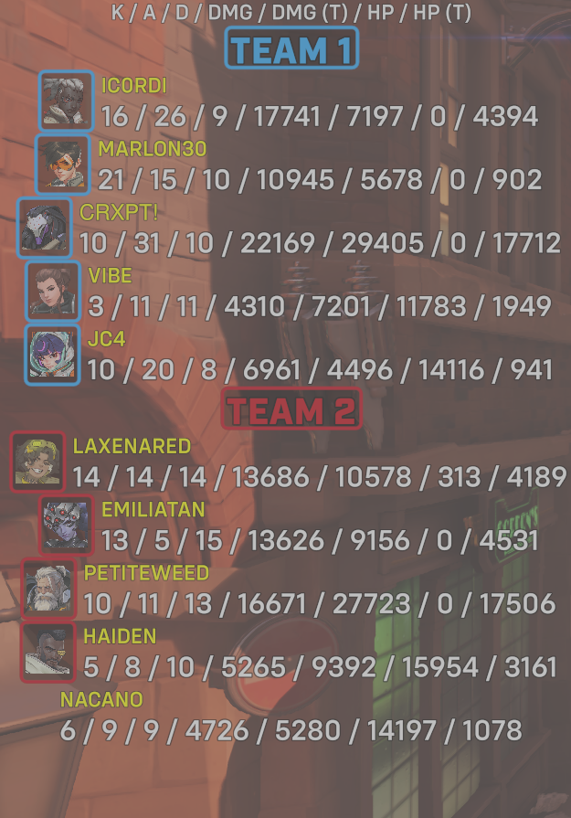 | Team | Player | Kills | Assists | Deaths | Damage | Damage (Taken) | Healing | Healing (Taken) |