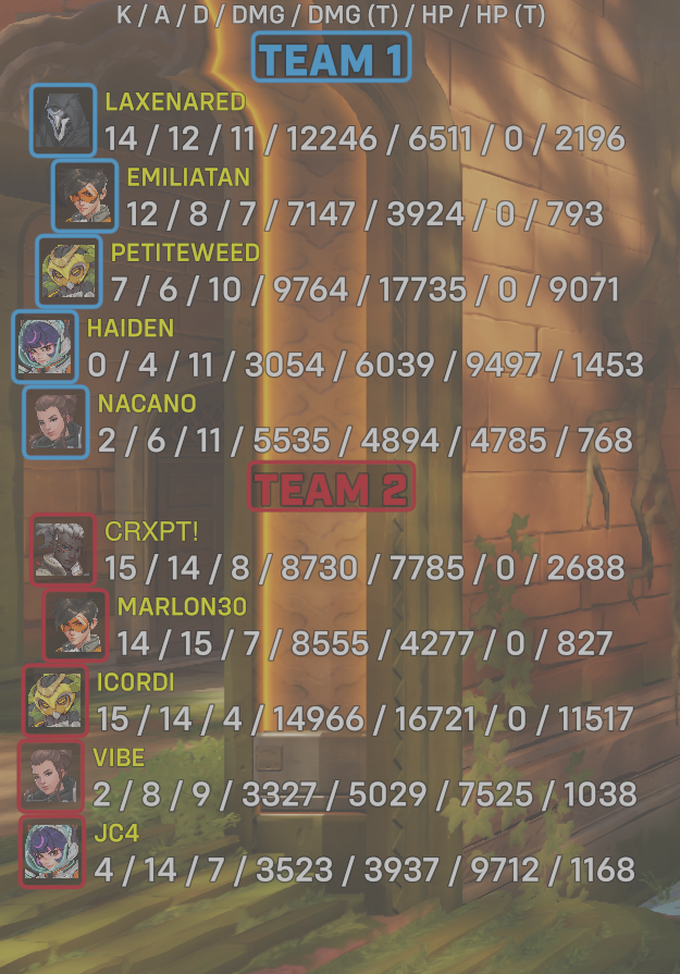 | Team | Player | Kills | Assists | Deaths | Damage | Damage (Taken) | Healing | Healing (Taken) |