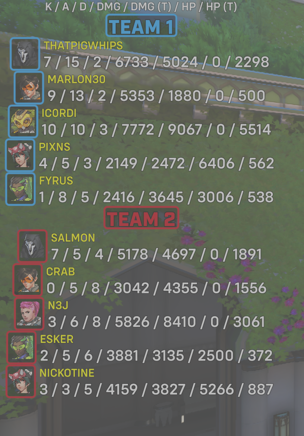| Team | Player | Kills | Assists | Deaths | Damage | Damage (Taken) | Healing | Healing (Taken) |