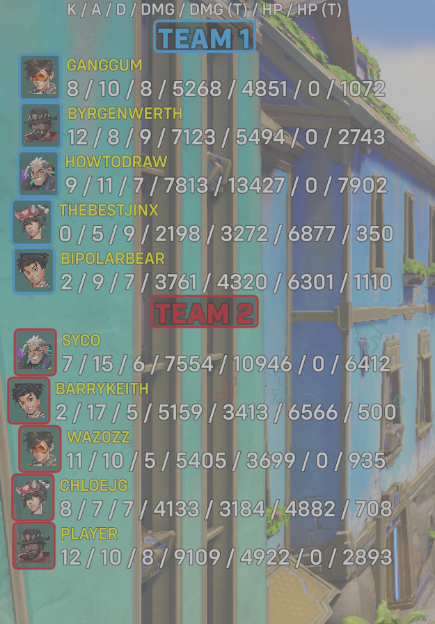 | Team | Player | Kills | Assists | Deaths | Damage | Damage (Taken) | Healing | Healing (Taken) |