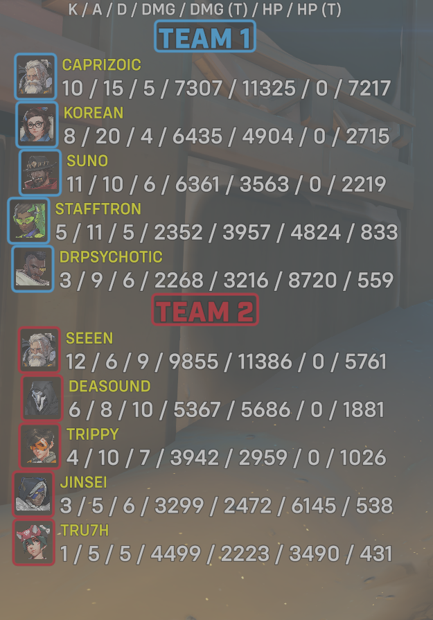 10 entries| Team | Player | Kills | Assists | Deaths | Damage | Damage (Taken) | Healing | Healing (Taken) |