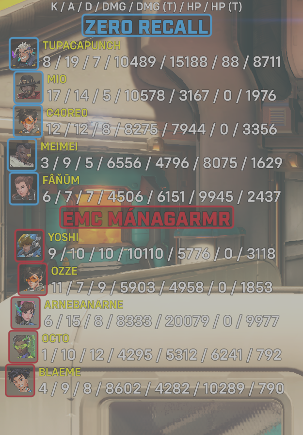 | Team | Player | Kills | Assists | Deaths | Damage | Damage (Taken) | Healing | Healing (Taken) |