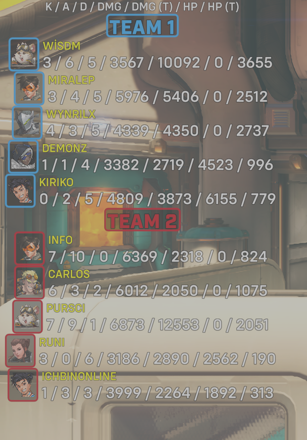 | Team | Player | Kills | Assists | Deaths | Damage | Damage (Taken) | Healing | Healing (Taken) |