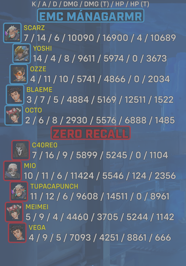 | Team | Player | Kills | Assists | Deaths | Damage | Damage (Taken) | Healing | Healing (Taken) |