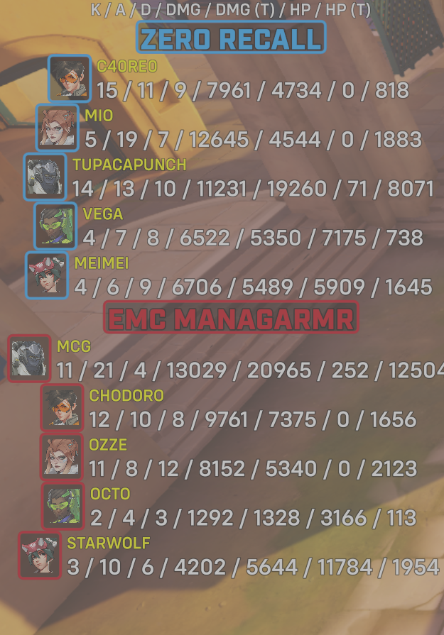 | Team | Player | Kills | Assists | Deaths | Damage | Damage (Taken) | Healing | Healing (Taken) |
