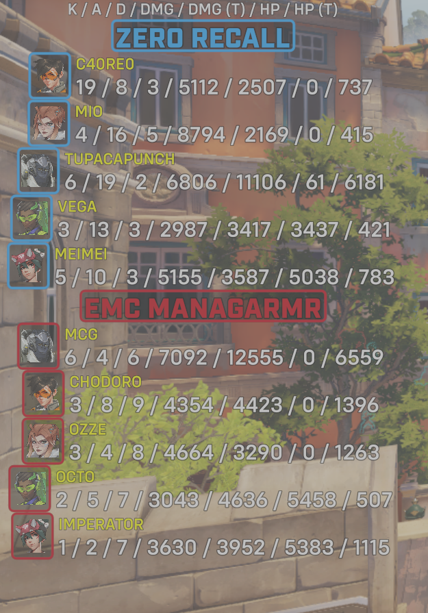 | Team | Player | Kills | Assists | Deaths | Damage | Damage (Taken) | Healing | Healing (Taken) |