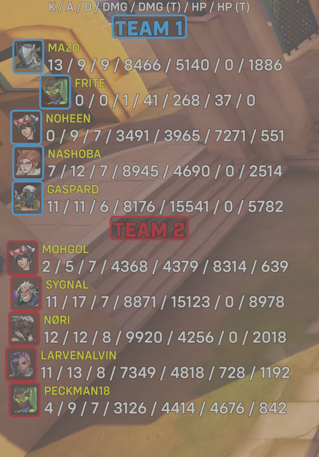 | Team | Player | Kills | Assists | Deaths | Damage | Damage (Taken) | Healing | Healing (Taken) |