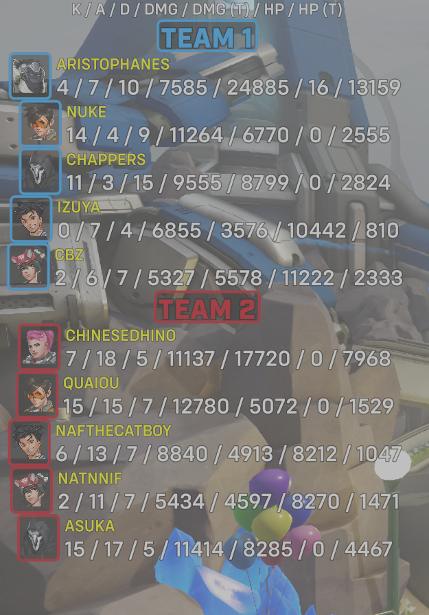 | Team | Player | Kills | Assists | Deaths | Damage | Damage (Taken) | Healing | Healing (Taken) |