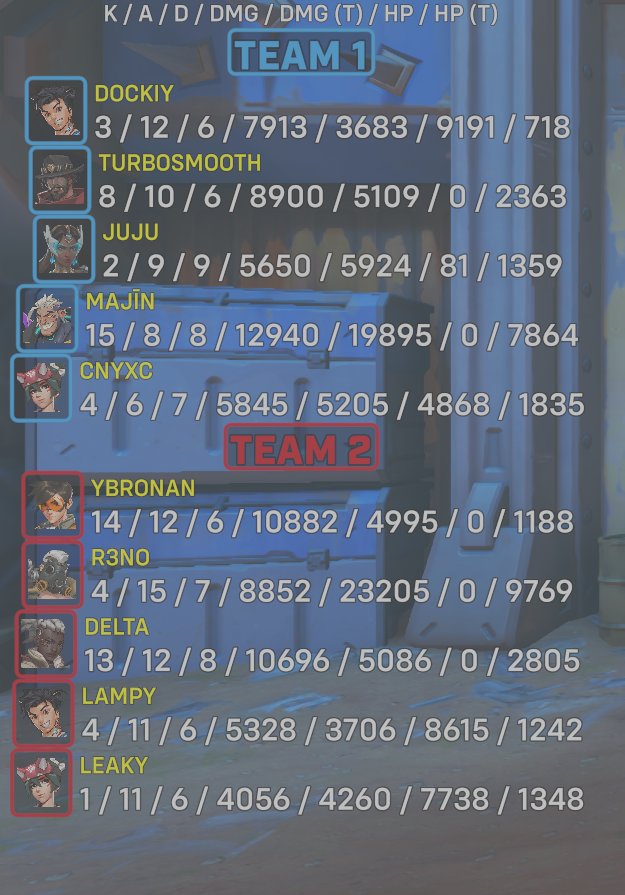 | Team | Player | Kills | Assists | Deaths | Damage | Damage (Taken) | Healing | Healing (Taken) |