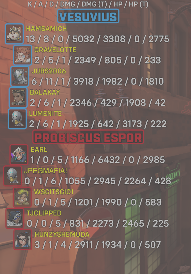 | Team | Player | Kills | Assists | Deaths | Damage | Damage (Taken) | Healing | Healing (Taken) |