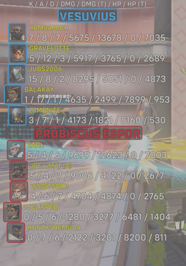 | Team | Player | Kills | Assists | Deaths | Damage | Damage (Taken) | Healing | Healing (Taken) |