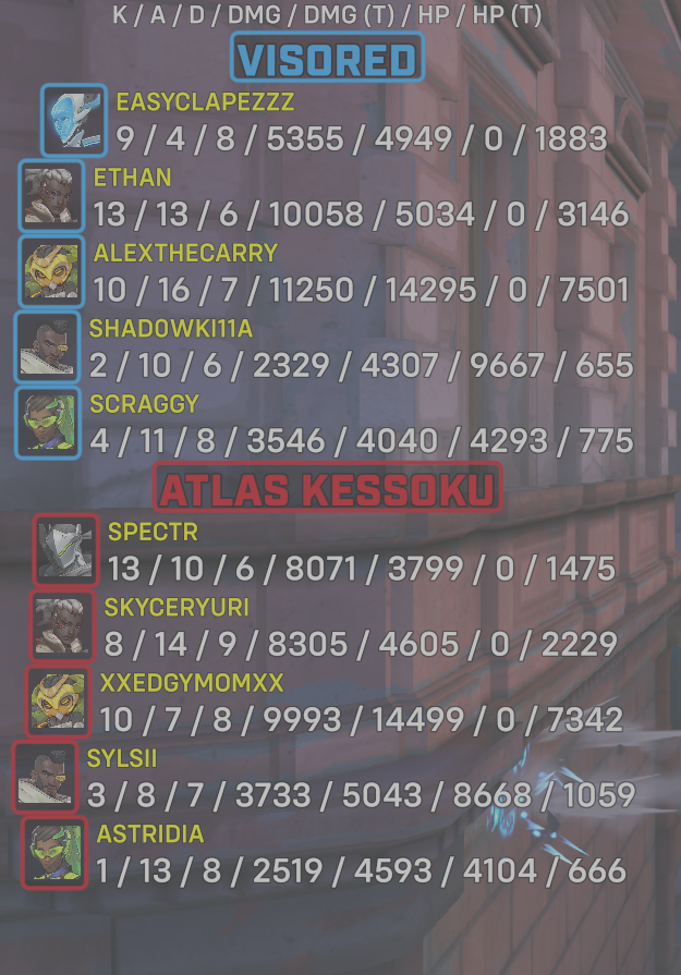 | Team | Player | Kills | Assists | Deaths | Damage | Damage (Taken) | Healing | Healing (Taken) |