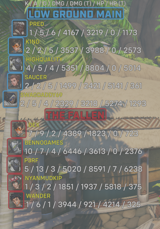 | Team | Player | Kills | Assists | Deaths | Damage | Damage (Taken) | Healing | Healing (Taken) |