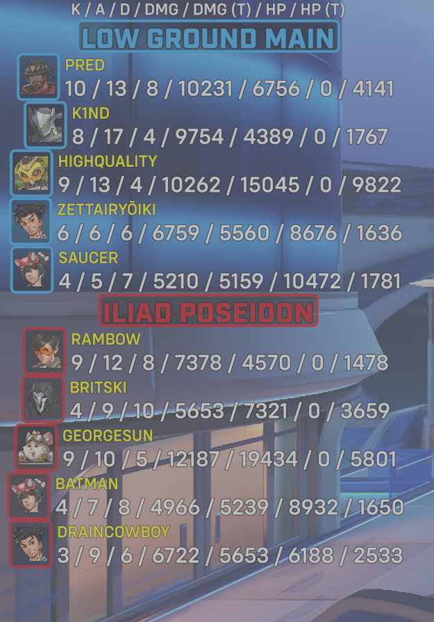 | Team | Player | Kills | Assists | Deaths | Damage | Damage (Taken) | Healing | Healing (Taken) |