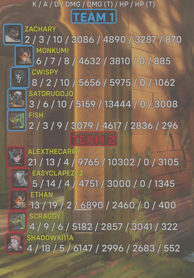 | Team | Player | Kills | Assists | Deaths | Damage | Damage (Taken) | Healing | Healing (Taken) |