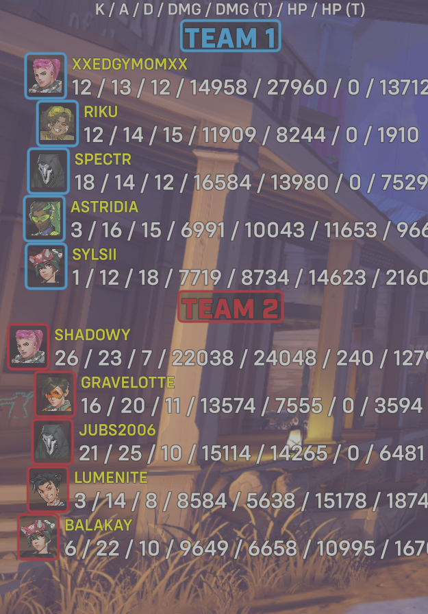 | Team | Player | Kills | Assists | Deaths | Damage | Damage (Taken) | Healing | Healing (Taken) |
