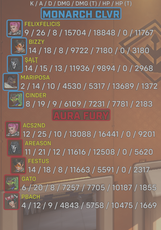 10 entries| Team | Player | Kills | Assists | Deaths | Damage | Damage (Taken) | Healing | Healing (Taken) |